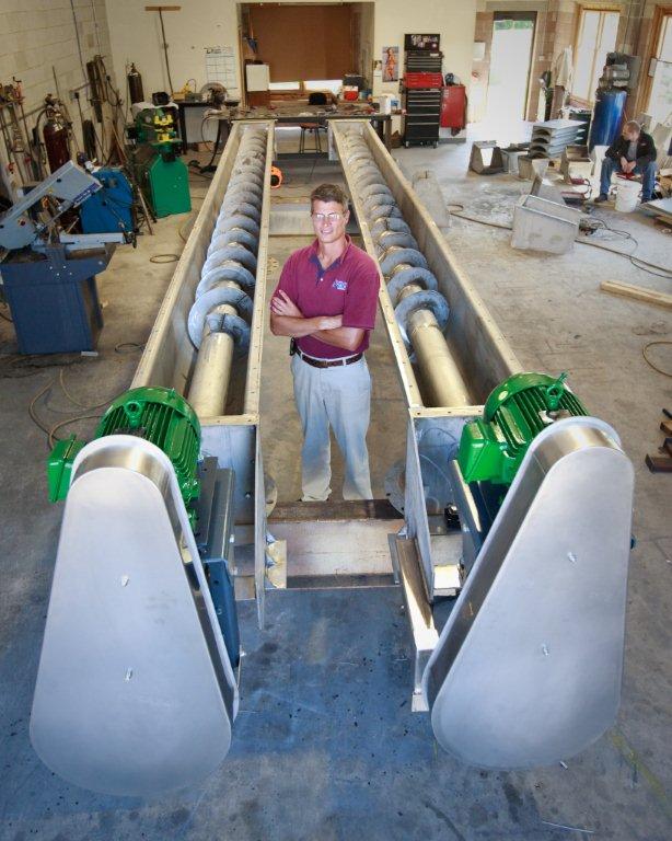 Materials of construction, for all equipment, range from carbon steel, stainless steel (304, 316, 309, 310, etc.), hastelloy, inconel, AR steel etc. If needed, we will polish to a #4 finish with continuous welds to CEMA IV, a Dairy or pharmaceutical finish. Our design and manufacturing have passed USDA inspection. When needed we will assist in the proper selection of specialty hardfacing and apply as required to combat abrasion. When screws or injector screws are in high heat applications we will put a baffled (water) jacket on the housing for “equipment protection”. When the heating or cooling of materials is desired a baffled jacket could also be used in conjunction with either heated or cooled fluid. When product contamination or cross contamination, sanitary cleaning etc. are concerns we design the equipment to your “wash down”, cleaning standards.